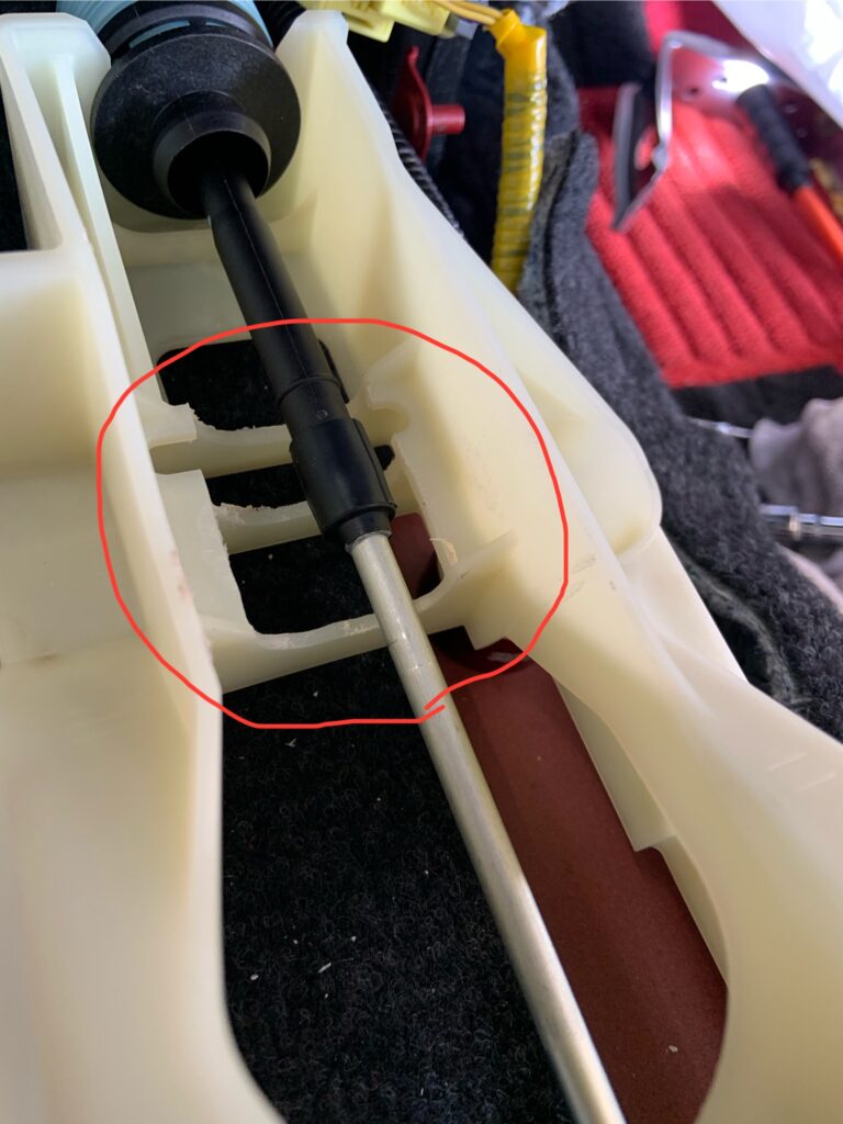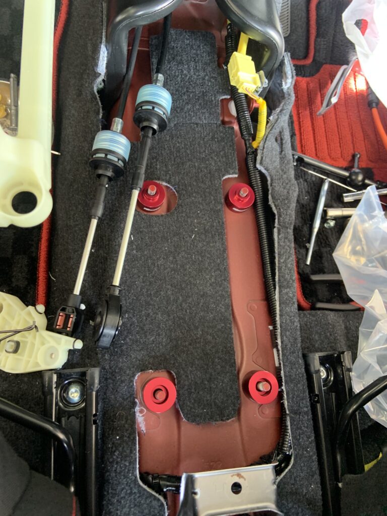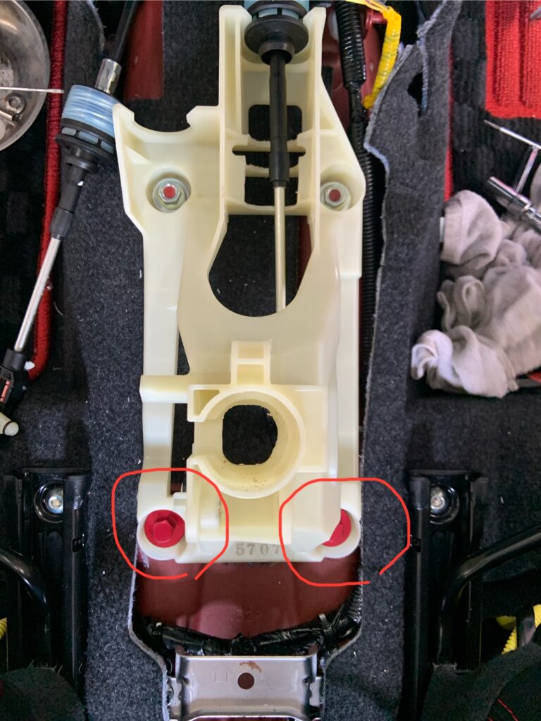 台座を固定する際、写真左側の赤丸の所は付属のナット、前側は純正ナットを再使用します。また、シフトケーブルを取り付けする際台座の位置が上に上がるため少し削る必要が有ります。シフトレバーを仮で取り付け左右に動かし干渉がない事を確認して下さい。