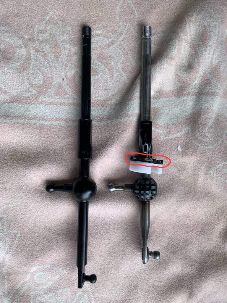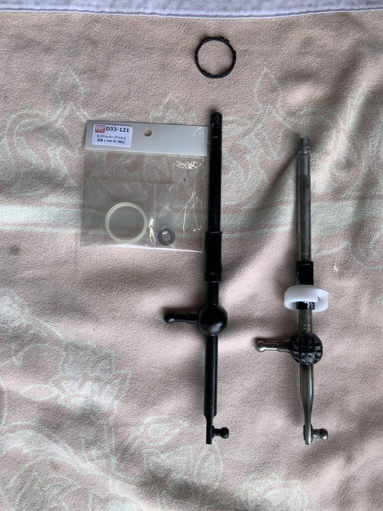 今回シフトレバーブッシュ(赤丸)もついでに交換していきます。新しいブッシュと比べてみると厚みがあり、シフトレバーも純正品と比べると少し長い感じがします。どんなフィーリングになるのか楽しみです。交換していくシフトレバーにグリスを塗り元通り組み付けていきましょう。