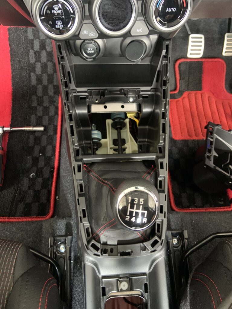 シフトレバーの樹脂製の台座を一度外し、車両から出ているボルトにカラーをかまし戻します。
