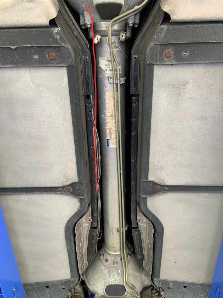 遮熱板を外すとシフトのケーブルが赤線の感じで取り回しされています。知恵の輪で外し新品と比べてみましょう。