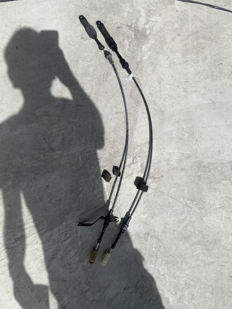 外観では一箇所割れてワイヤーが剥き出しになってしまっています。また、シフトにつながる部分はプラスチックの部品が綺麗に無くなってしまっていました。恐らくこれが原因でシフトとケーブルが分かれてしまい、シフトのみが動き、ミッションに伝わらなくなりギアが切り替わらなくなっていたと考えられます。ミッション側も同じ感じで刺さっているのですが取り外す際割れて粉々に.....経年劣化ですね